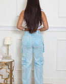 These wide-leg cargo pants combine a high-waisted design with a semi-stretch fabric blend of 98% cotton and 2% spandex for comfortable movement. Featuring an elastic waistband and practical pockets, they provide both style and functionality. With a 30-inch inseam, they offer a modern, flattering fit. Easy to maintain with hand wash cold care, these pants are a versatile addition for a confident, effortless look.