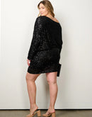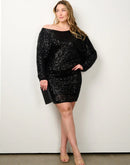 This plus size long sleeve off shoulder dress in black features sequins and a bodycon fit, perfect for special occasions. Enhance your curves and make a statement with this stunning mini dress. Comfortable and stylish, this dress combines glamour and confidence for a show-stopping look.
