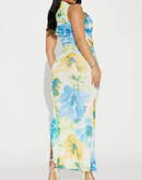 The Abigal Floral Mesh Maxi Dress in an blue combo combines elegance with modern design elements. Featuring a high neck and sleeveless silhouette, this dress showcases strategic ruching and a sophisticated slit for enhanced movement. The vibrant floral print adorns a comfortable stretch mesh fabric (96% Polyester, 4% Spandex) with a full lining (100% Polyester) for optimal coverage.