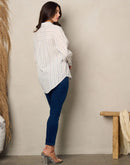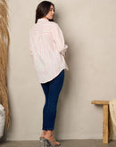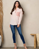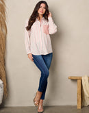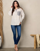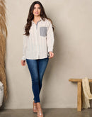 100% cotton women's shirt. Long sleeve front pocket button up stripes top.