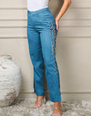 100% Cotton Women Jeans. Button closure pockets wide leg side lace up Denim jeans